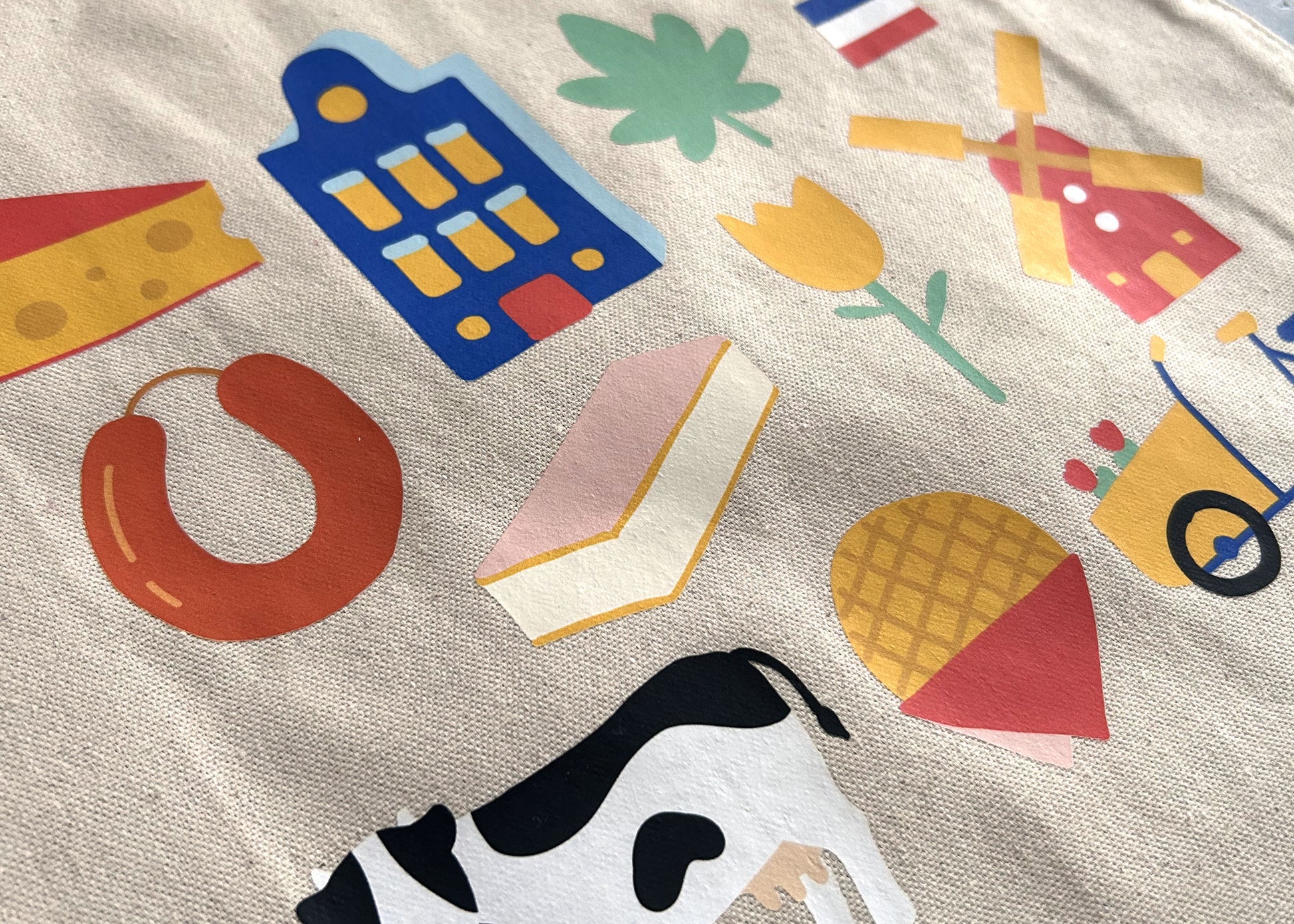 A charming cotton tote bag featuring hand-drawn illustrations of iconic Dutch symbols — cheese, tulips, clogs, windmills, stroopwafels, bikes and more.
