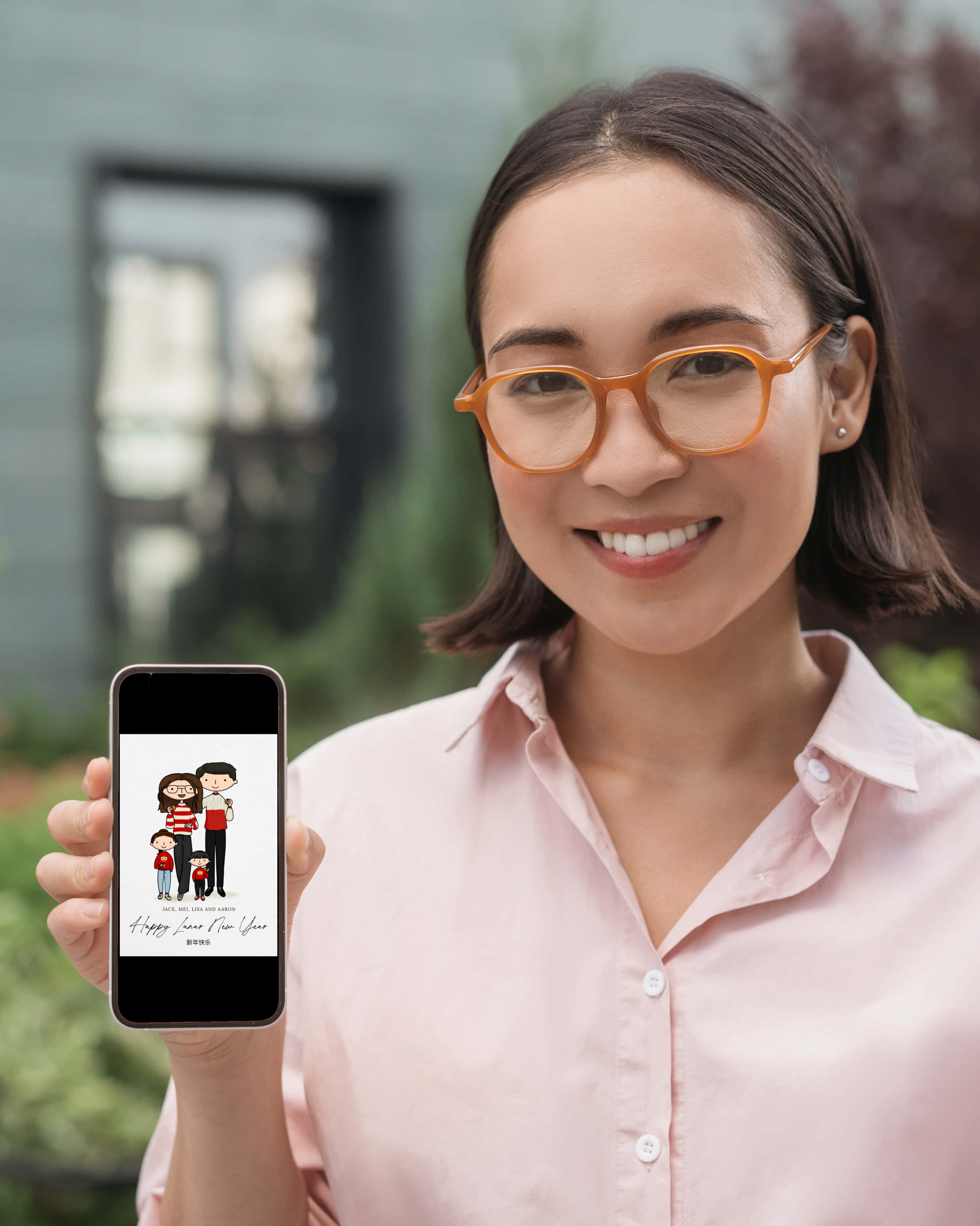 "I’ve never seen a LNY card where you can customize the people. It was actually fun to pick out the outfits and hair to match my family. I sent the digital version and everyone thought I’d hired a professional illustrator. So cool!" — Mei L.